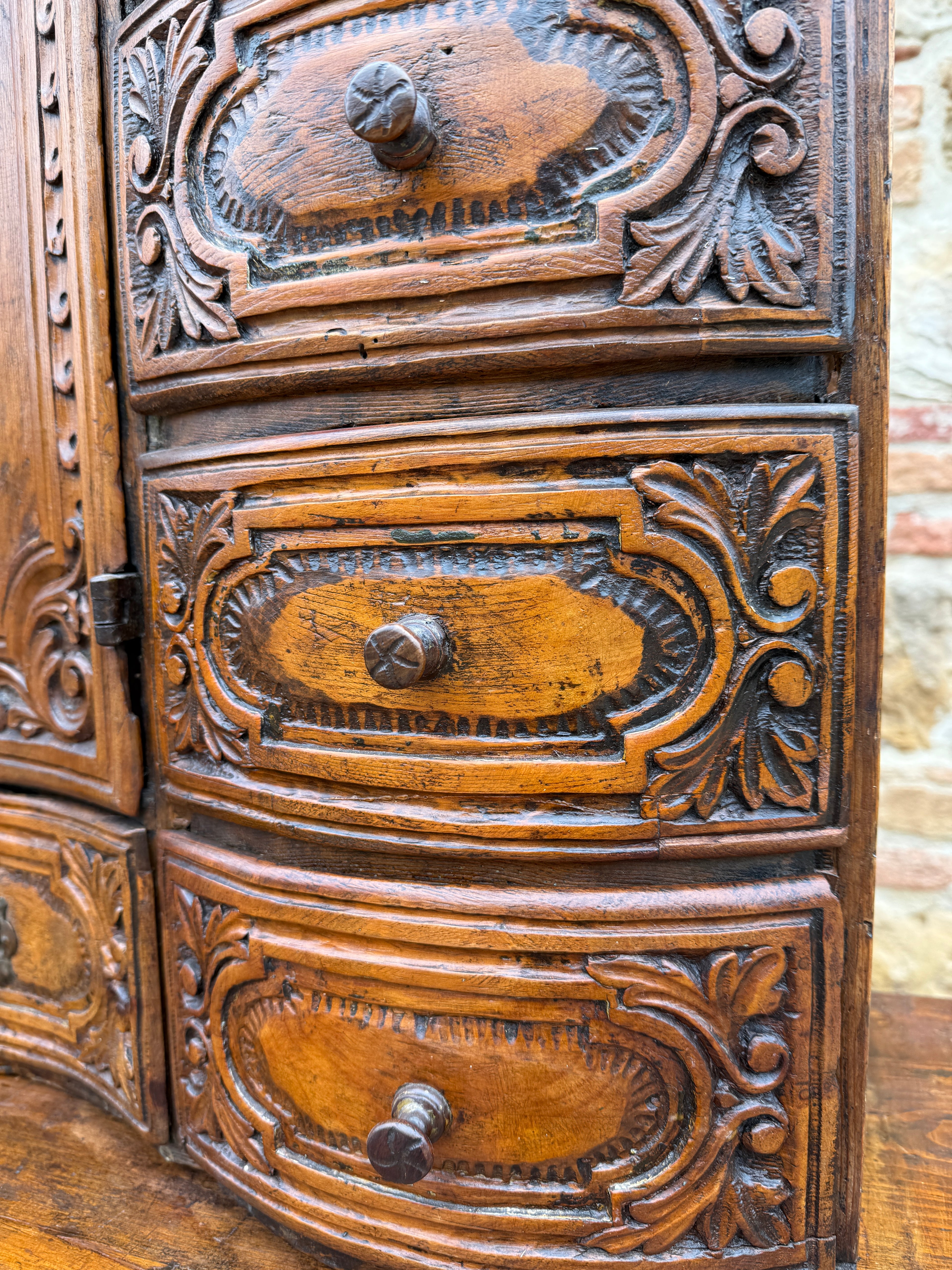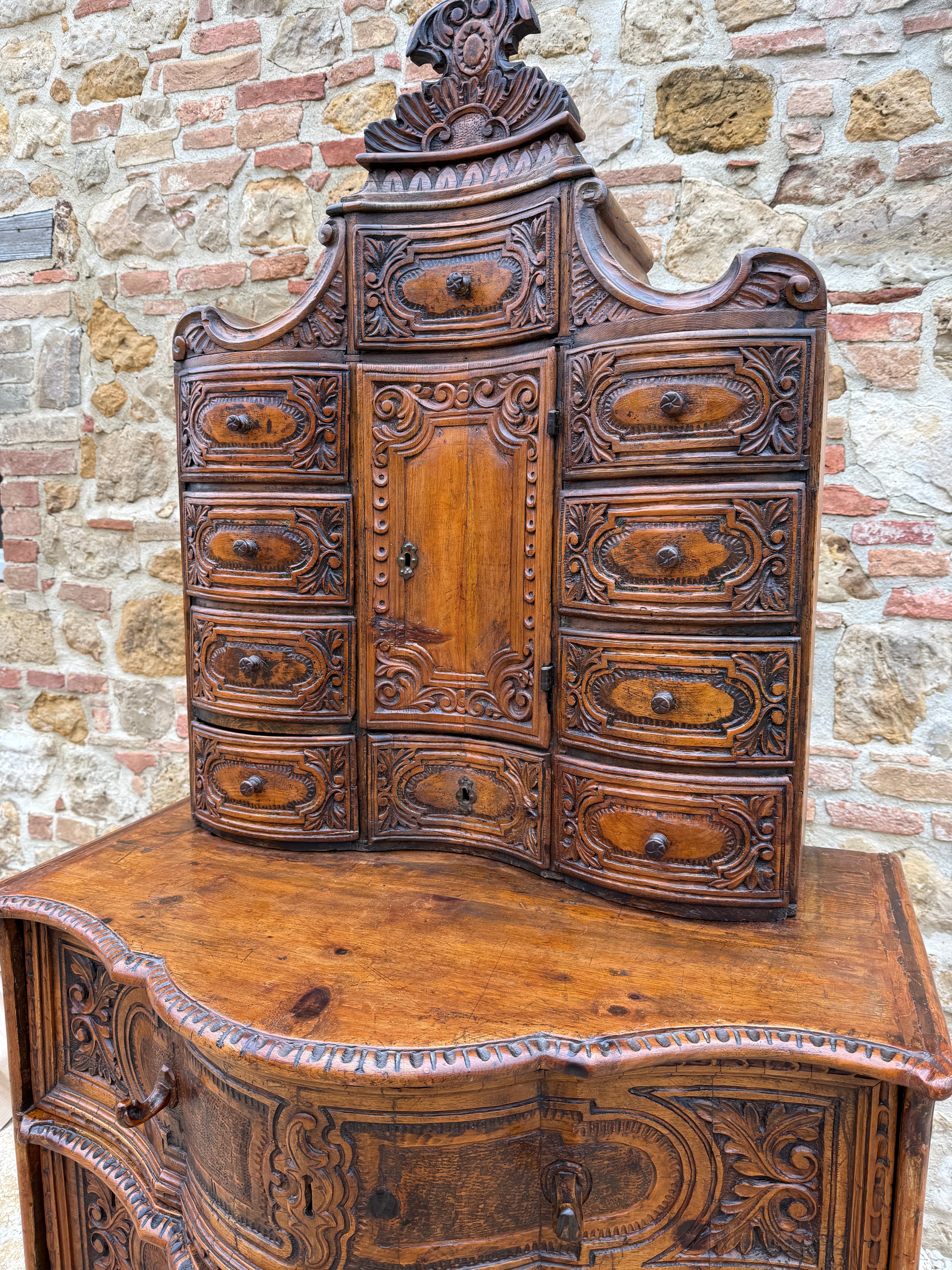 This two piece pine wood chest is a rare example of hand carved workmanship from the Sud Tyrol region of Italy.