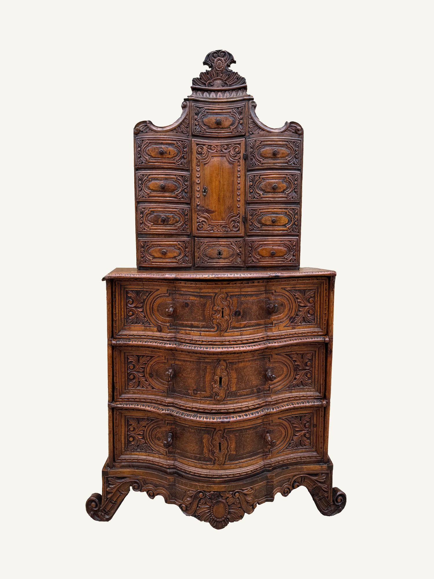 The chest contains three lower drawers and 10 upper drawers with a small center cabinet. The locks and key are original.