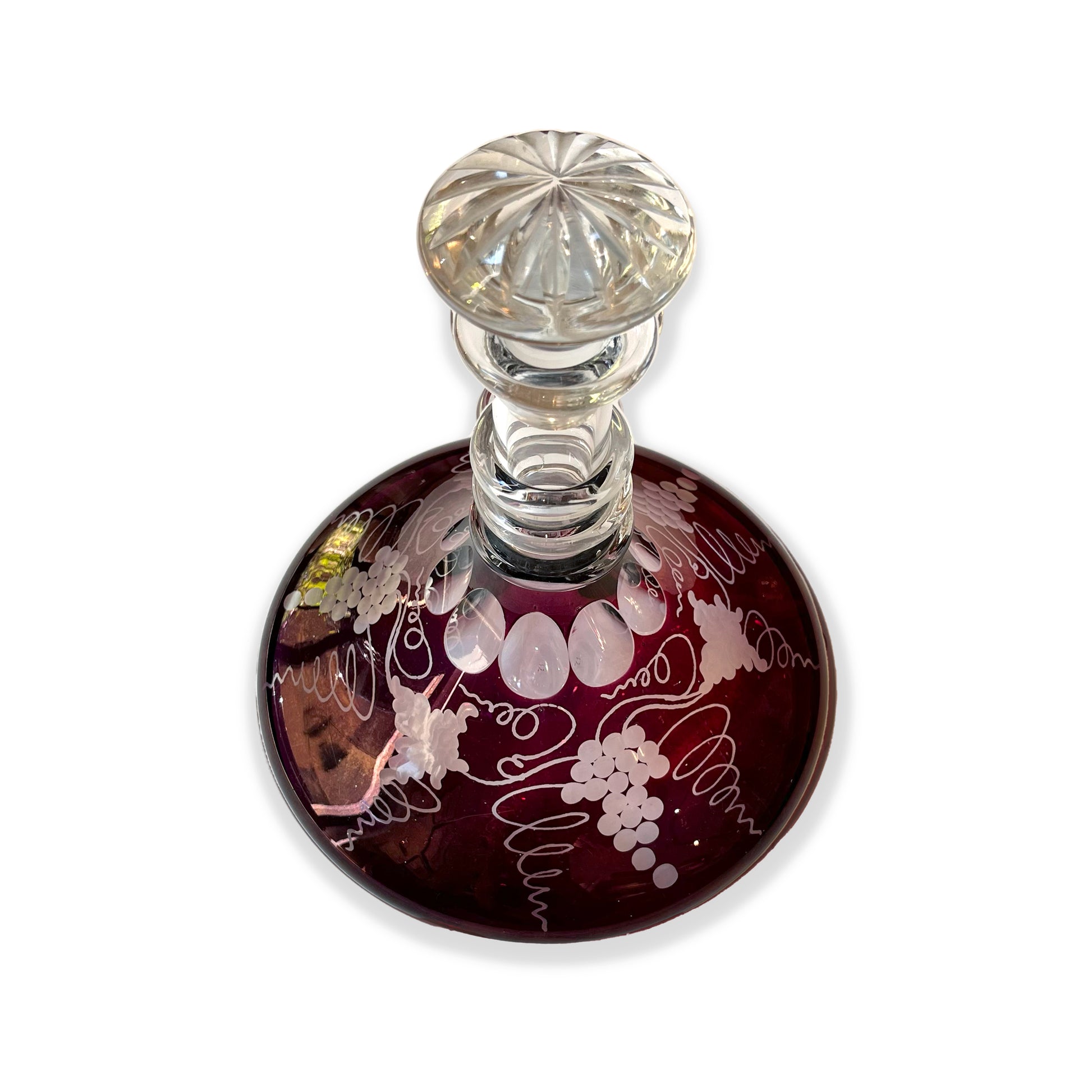 This wonderful pair of red wine carafes are beautifully hand-etched with grapes and whimsical vines. A unique set made in two different shades of the color of wine.